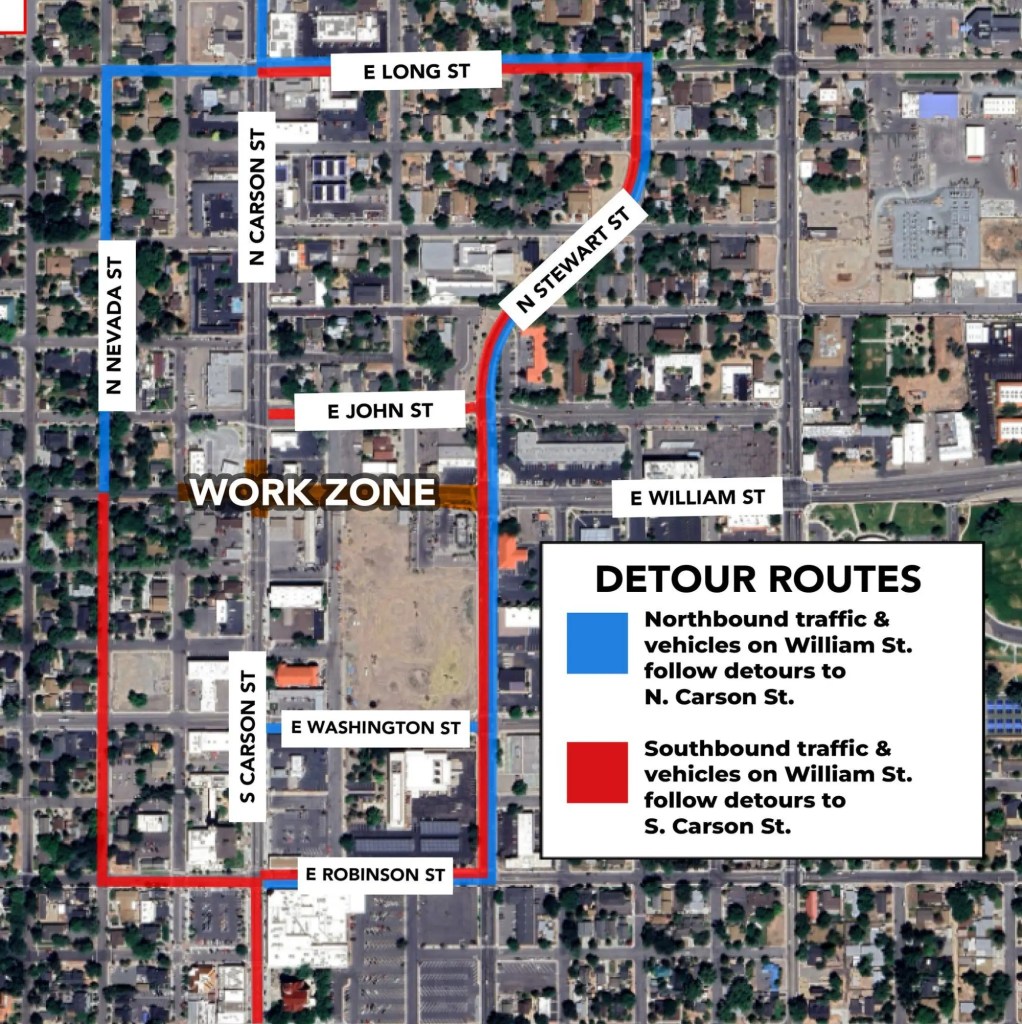 See the interactive map here and go here for updates. Crews plan to have the underground utility at work at Carson and William streets completed by Thursday, Oct. 30 before the Nov. 1 Nevada Day celebration.