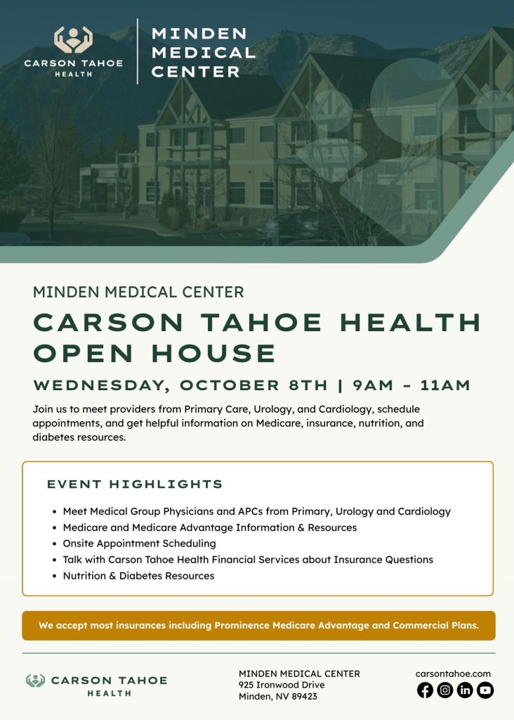 Carson Tahoe Health invites the community to an Open House at Minden Medical Center on Wednesday, October 8th, from 9 a.m. to 11 a.m. All are welcome to attend, meet providers from Primary Care, Urology, and Cardiology, schedule appointments, and receive helpful information on Medicare, insurance, nutrition, and diabetes resources.