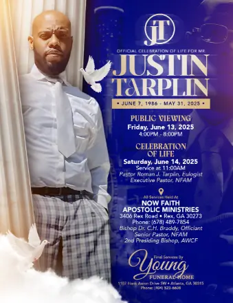 Justin Tarplin passed Saturday, May 31, 2025. Funeral service will be held Saturday, June 14, 2025 at 11:00 a.m. Now Faith Apostolic Ministries. Internment follow at Kennedy Memorial Gardens. Viewing will be Friday, June 13, 2025 from 4:00 p.m to 8:00:p.m.