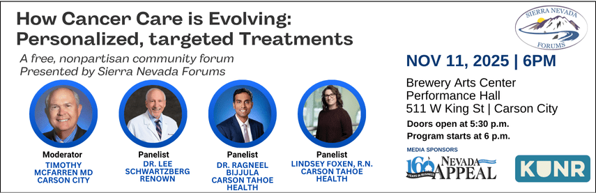 Tonight, Sierra Nevada Forums is hosting the panel How Cancer Care is Evolving: Personalized, Targeted Treatments at the Brewery Arts Center, located at 511 W. King Street in Carson City.